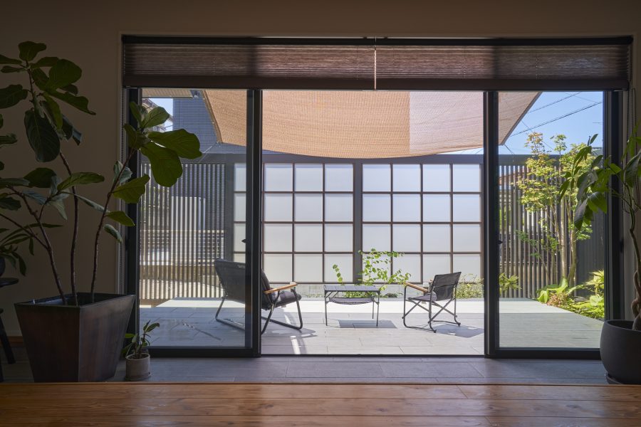 コの字型の中庭テラスは、部屋同士をつなぐ動線にもなります。