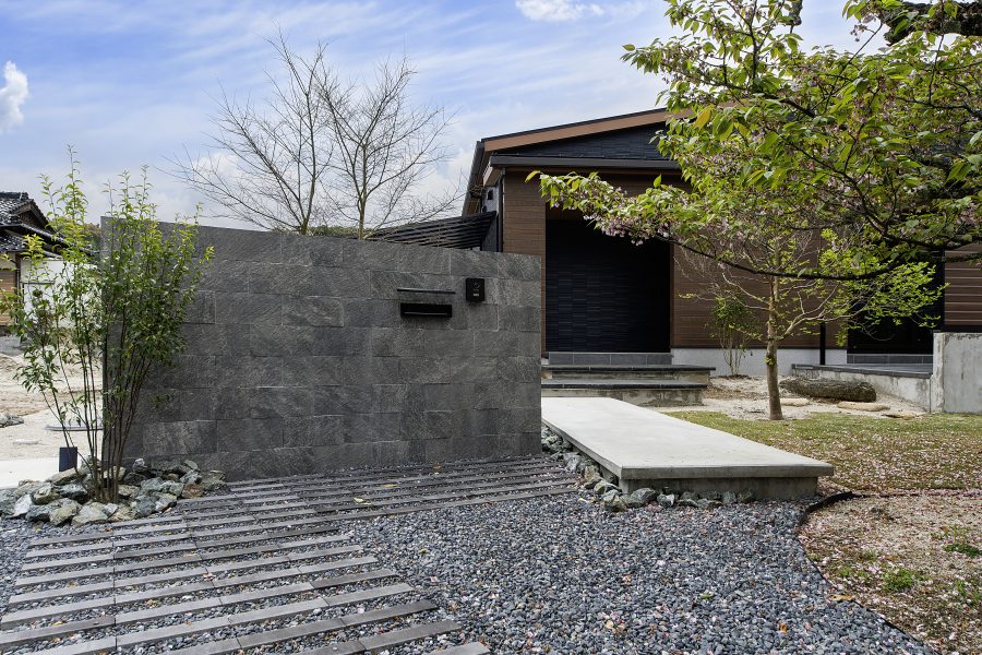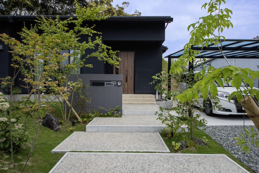 門まわりやアプローチで横の広がりを意識し、庭を生活空間の延長として計画することで、