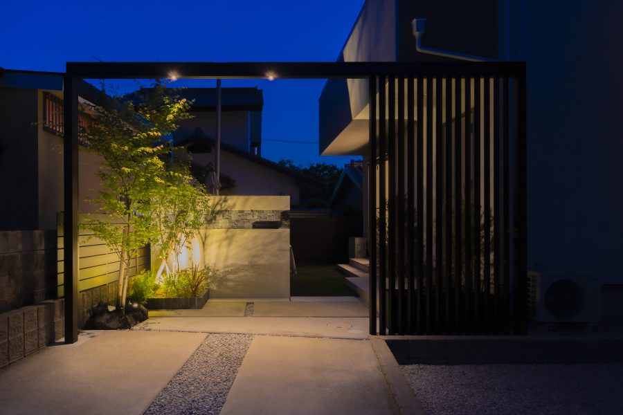 旗竿地は道路からの距離が長いので、安心して駐車したり、歩くことができるよう、足元を照らす照明や、カーポートやフレームなど上から照らす照明を計画するといいですよ。