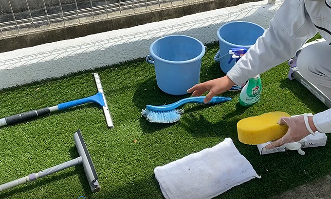…ホースで水をかけるか、しっかり濡らした柔らかい布やスポンジで表面の汚れを落とします。