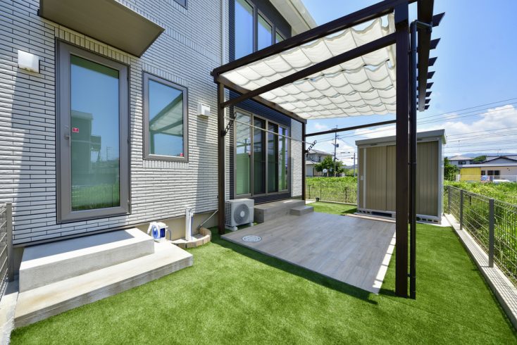 お庭のテラス屋根を広めにとって、雨の日は自転車もおけるようなスペースを作る方法もあります。