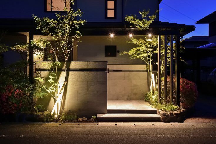 階段があるアプローチの場合、夜でも安心して歩けるように足元を照らす照明を設置しましょう。玄関まで灯りが優しく誘導してくれるような配置にするのがおすすめです。フレームやカーポートなどに設置するダウンライトや、樹木や壁を下から照らすスポットライト、高さの種類豊富なポールライトなど、照らし方も様々です。