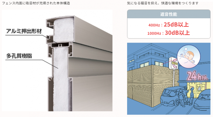 近隣のお店や住宅の音が気になってしまう環境の方におすすめな防音フェンス。フェンスの内側にある遮音性能の高い多孔質樹脂が気になる騒音を抑えてくれるアイテムです。線路や踏切近くにお住まいの方にもおすすめですよ。