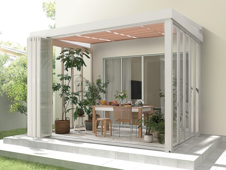 開放感を楽しむプライベート空間にするために、周囲の視線が気にならないよう、ウォールやフェンス、樹木などで安心できる囲いをつくってあげると良いですね。プラスGならルーフを張り出したり、フレームを接続してガーデンルームと一体型の回廊を作ったり、パーゴラやデザイン格子などと組み合わせて抜け感を出したりなど、様々なデザインをすることができます。
