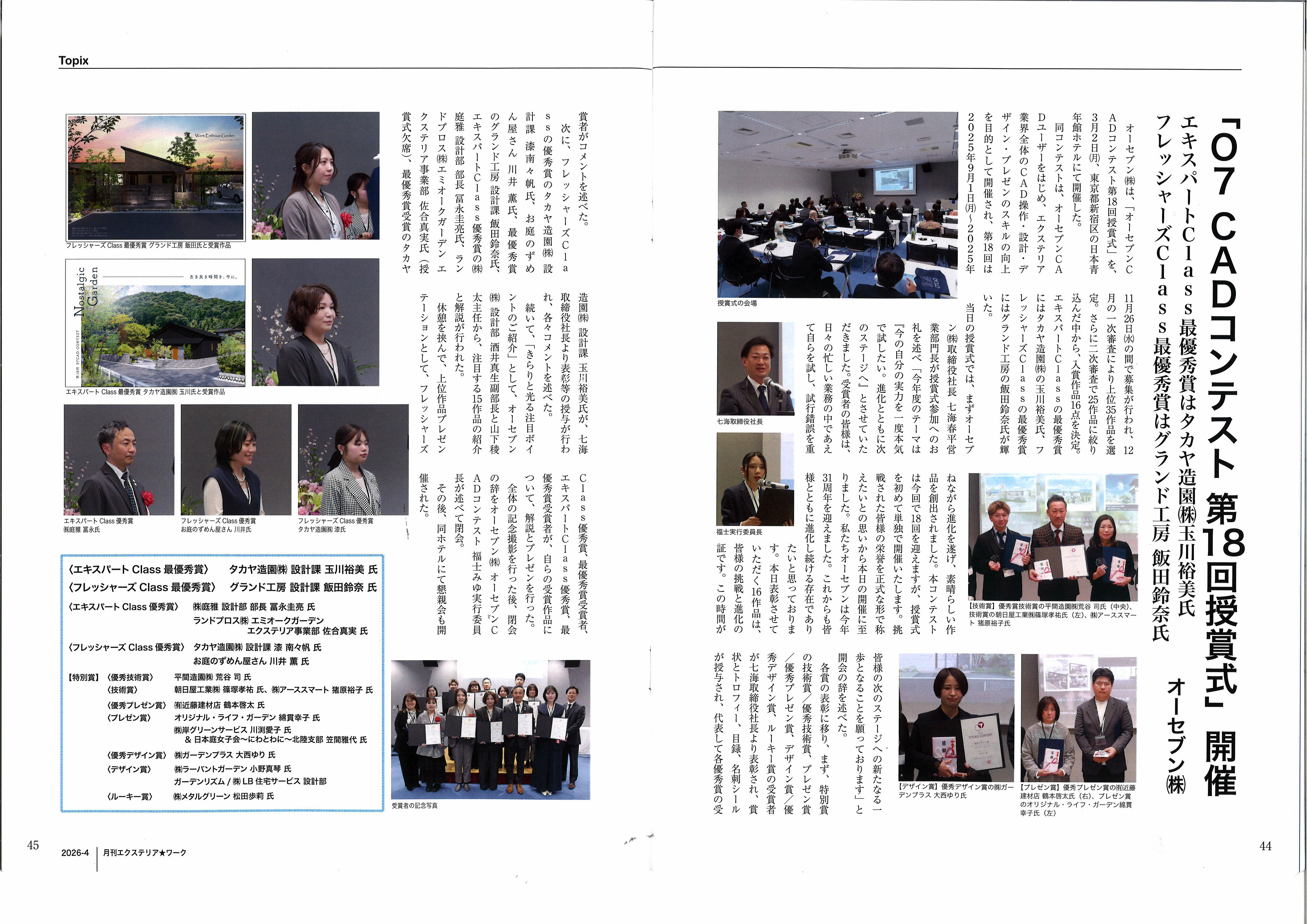 雑誌月刊エクステリア・ワークにて、『O7CADコンテスト 第18回授賞式』の様子が掲載されました。Media 2026年04月24日 ▲「月刊エクステリア・ワーク」 『第18回オーセブンCADコンテスト』フレッシャーズクラスで設計課 飯田が最優秀賞を受賞しました。 詳しい受賞内容はこちら 一覧へ