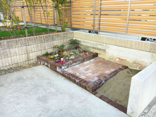 水たまりのできるお庭を、お子様たちが遊びやすいようにしたいとご依頼いただきました。お庭の中心は人工芝にして、窓の前はタイル敷きに。また駐車場の一角にあった天然芝もスッキリさせ、花壇と砂場をつくりました。砂場はお子様が成長なさったら、花壇に変えて楽しむことができます。