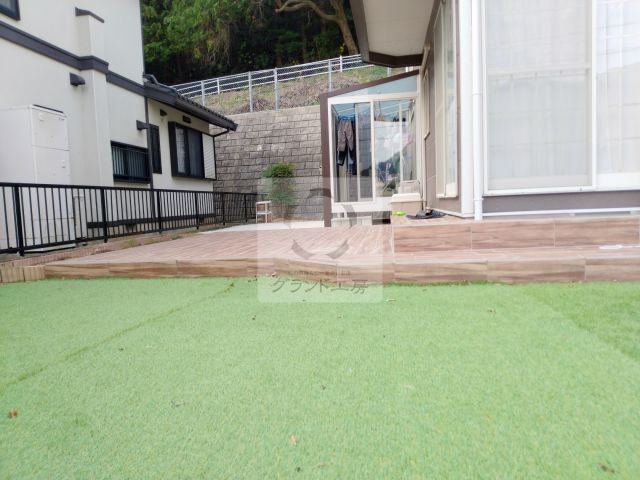 木目のタイルを使用したことでナチュラルに仕上がり、人工芝との相性もばっちりです☆