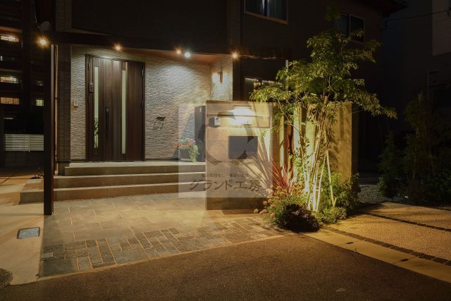 新築外構のご相談でした。家に対してななめに門塀を施工。フレームの+Gをくぐり道路から自然と玄関のほうに誘導されます。照明は表札灯、アプローチを照らすダウンライト、シンボルツリーを照らすアップライトを施工。お庭は道路から丸見えになるので、プライバシー対策のフェンスを設置。お庭の真ん中にタイルテラスを施工。植物が好きな奥様の植物に囲まれるようなお庭にしたいというご要望で、周りにポポラス、オリーブ、ヤマボウシ、スモークツリーなど、収穫してブーケに出来そうな樹木を植えました。グレーの洗練された雰囲気と柔らかい緑が似合う外構になりました。