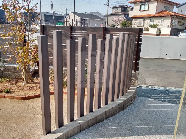 道路側からお庭が丸見えの状態でした。目隠しがしたいが、アプローチ部分が綺麗なカーブを描いており、フェンスでの目隠しが難しい為、ポールにてデザインしました。ポールは見る方向によって隠れる場所や日が抜ける場所が異なる為、施工場所により印象が大きく変わります。目隠しを兼ねた独立タイプの自転車置き場も施工しました。お家のスッキリした雰囲気とシルバーの色合いがとても合っています。お庭には木目調のテラスを施工しました。