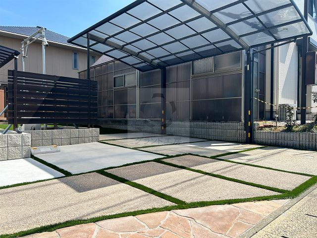 車庫増設とお庭・門まわりのご相談をいただきました。駐車場は既存土間を活用しながら、駐車場を広げる部分には新しく土間を施工しています。道路からお庭のデッキが丸見えにならないようお庭と駐車場の境目の一部に目隠しフェンスを設置。お庭部分にも樹木があり土の状態でしたので、雑草対策を兼ねて人工芝を施工。門回りはプライバシーを考えて入り口からクランクをして玄関まで行くという動線にしています。インターホン・表札は道路側の塀に、ポストは玄関から近い方の塀に設置。カッコいい2枚の塀をどっしり構え、新しい「家の顔」となりました。