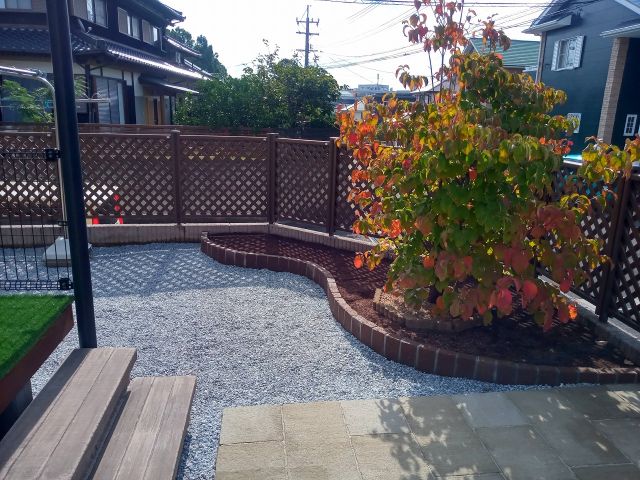 家族が集まった時ゆっくりできるお庭にしたいとご要望をいただきました。雑草対策としてインターロッキングを使用し、お庭をデザインさせていただきました。床面に東洋工業のカルムペイブを敷き、ベンチの座面は 同じく東洋工業のヴィンテージウッドペイブを使用しています。花壇はハナミズキを囲うようにレンガで施工し、お花を定期的に植え替えて楽しめる様に広めの花壇を計画しました。