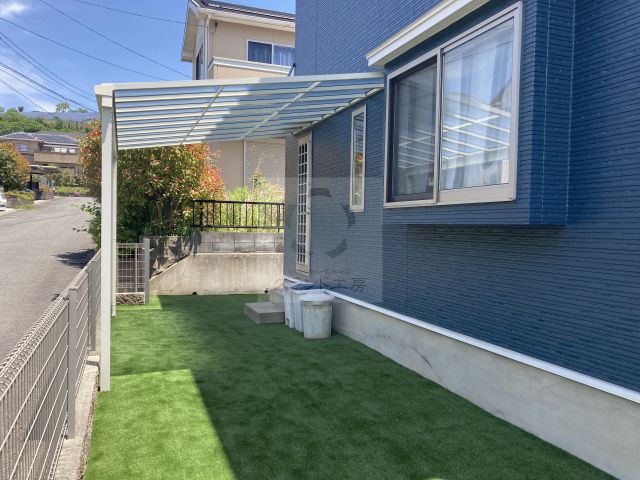 お庭が土の状態で、わんちゃんが遊べるドッグランを作りたいとのご相談を受けました。お庭を広く使えるように、窓にかからない位置に門扉とフェンスを設置し、雑草対策も兼ねてお庭全体に人工芝を施工しました。勝手口にはテラス屋根を設置し、柱が邪魔にならないようブロック際に寄せて取り付け、雨の日でも濡れずにゴミ出しができるようにしました。また、夏場は日陰ができ、わんちゃんの休憩場所にもなります。裏庭は防草シートと砂利敷きで雑草対策を施しました。
