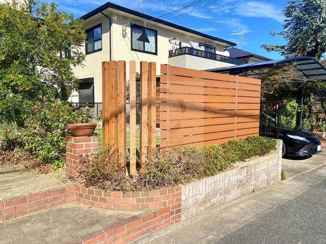 天然芝と生垣のお庭を、思い切ってメンテナンスが楽なお庭にしたいとご相談いただきました。洋風のお家にぴったりの木調フェンスと人工芝のナチュラルガーデンをご提案。生垣や芝をすっきり撤去して、ローメンテナンスな人工芝を敷いたお庭は広く感じられるようになりました。自然石ピンコロで仕上げた花壇の曲線ラインや、柔らかい雰囲気で目隠しできる木目調のポールがアクセントです。