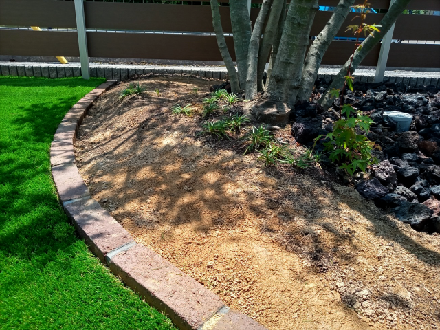 目隠しフェンスと、雑草対策のご相談をいただきました。 今回は、グローベンの木樹脂フェンス「PLAD one」を使用しました。圧迫感が出ないように高さは1.2mに設定し、幅15cmの板を2cmの隙間で配置しました。外観に調和する落ち着いた色を選んだことで、お庭全体が自然になじんでいます。 もともと大きく広がるモミジと真砂土だけだった花壇は、モミジを剪定し、溶岩石と築山、レンガを使って新しく仕上げました。さらに雑草対策としてふかふかの人工芝を敷いたことで、お庭全体が明るく爽やかな印象に変わりました。
