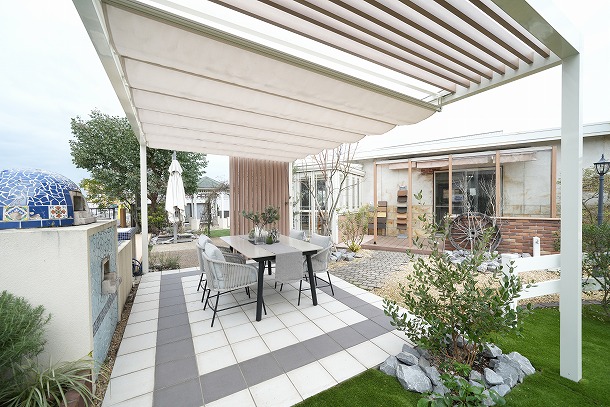 新宮店の展示場は、実際の暮らしをイメージしながら外構やお庭づくりを検討できる体感型の展示場です。 素材サンプルを見るだけでなく、動線や空間のつながりを実際に歩きながら体感でき、「完成後の暮らし」が自然と想像できるのが特徴です。独立オーニングを設置したキッチンガーデンでは、家事や食事を楽しむ屋外の過ごし方をリアルに体感でき、光がやさしく差し込むガーデンルームは、ご家族や友人と団欒の時間を過ごす空間としてご提案しています。 お庭づくりが初めての方でも、図面だけでは分かりにくいポイントを実物を通して確認しながら、安心して検討を進めていただけます。