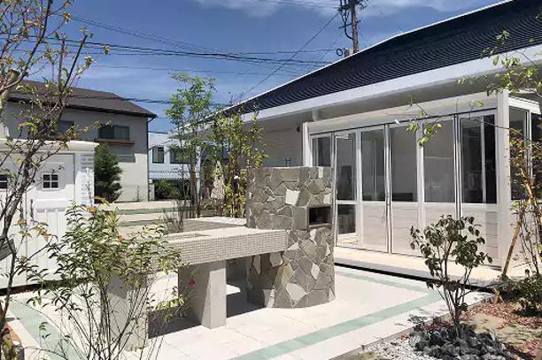 小倉店の展示場では、素材や商品を並べた展示ではなく、外構や庭が完成したあとの「暮らしのシーン」そのものを体感できる展示場です。 モノトーンを基調としたモダンナチュラルなアプローチや、壁泉のある落ち着いた空間、ガーデンルームを備えた庭など、テーマごとに異なるシーンを実際に歩きながら体感できます。 ホワイトで明るいキッチンガーデンや、石窯を取り入れた庭空間では、「庭で過ごす時間」や「家族や友人との過ごし方」まで具体的にイメージできるのが特長。 図面や写真だけでは分かりにくい距離感や居心地を体感しながら検討いただけます。