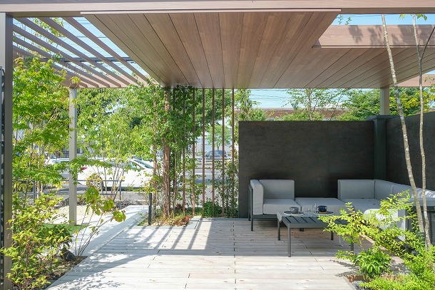 佐賀店の展示場は「リビングガーデン」をテーマに、屋根や目隠しを兼ねたデッキスペースを中心とした、居心地のよさを体感できる空間です。 人気のSC屋根を設置したカフェスペースをはじめ、人工芝や砂利敷きによる雑草対策、管理しやすいレイズドベッドやグリーンスペースなど、日々の暮らしに無理なく寄り添う庭の工夫を実際にご覧いただけます。 平坦で敷地にゆとりのある佐賀の住まいに合わせ、「外で過ごす時間」を自然に取り込む庭づくりを、五感で感じていただける展示場です。