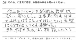 • 仕上がりイメージを具体的に説明してもらい、安心した。工事期間も平日で土日をはさまないでほしいという要望にも対応してくれ助かった。また何かあれば相談したい。