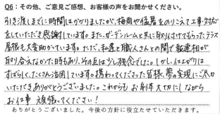 引き渡しまでに時間はかかりましたが、梅雨や猛暑をのりこえて工事・対応をしていただき感謝しています。また、ガーデンルームと共に取り付けてもらったテラス屋根も大変助かっています。ただ、私達と職人さんとの間で報連相が取り合えなかった時もあり、その点は少し残念でした。しかし、仕上がりはすばらしく、たくさん活用しています。携わってくださった皆様、夢の実現にご尽力いただきありがとうございました。これからも、お身体大切にしながらお仕事頑張ってください!※読みやすいようにテキストにしております