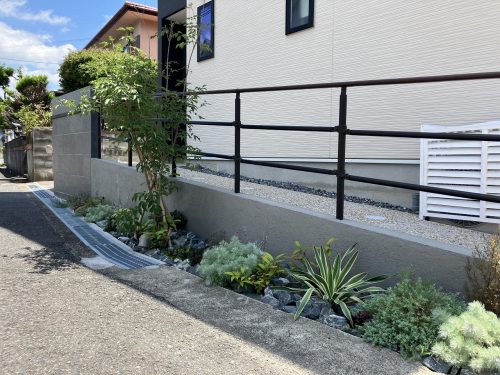 完工当時は落葉シーズンでしたが7月頃にお伺いした際には緑が綺麗に茂って、より素敵なアプローチ周りとなっていました。