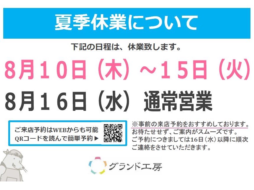 ご覧いただいている皆様へ、グランド工房夏季休業のお知らせです。