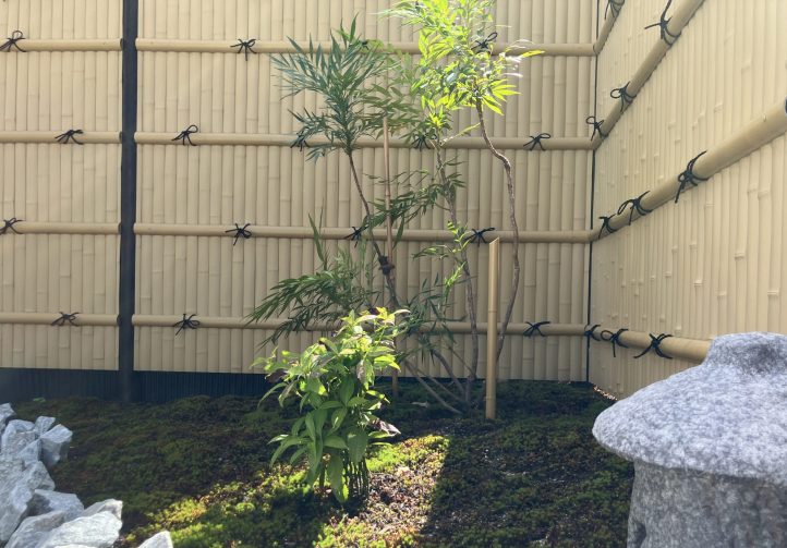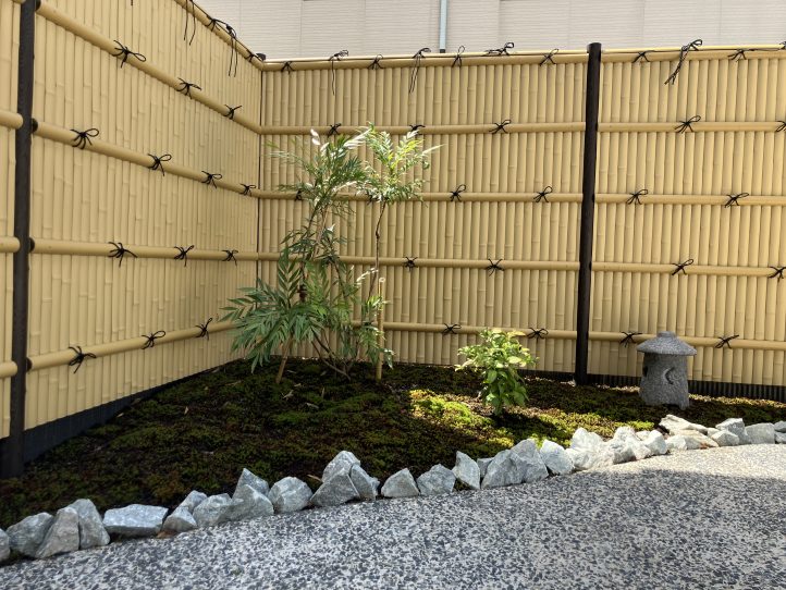 室内から見える空間には、既存の竹垣フェンスを背景に、苔の築山と植栽、和風ライトを配置しました。