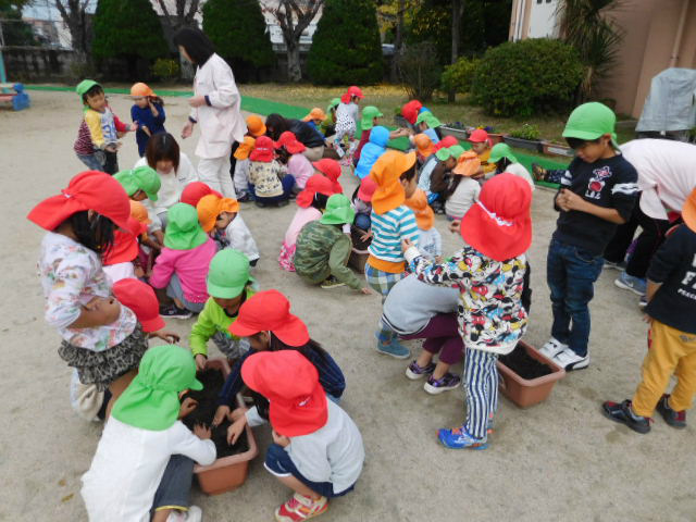 今年も、園児の皆さんにチューリップ植え込みお手伝いしてもらいました。