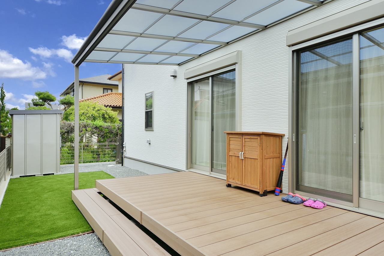 ウッドデッキで、ゆっくりくつろいでも素敵!大きめのテラス屋根があるので雨が降っても大丈夫!