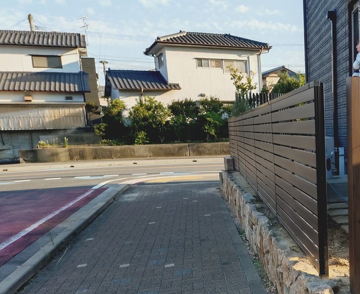 道路からの歩行者の視線も、気になりません。目隠しは三協 シャトレナⅡ 木調を使用しています。フェンス下の隙間も、ブロックでしっかりガード。