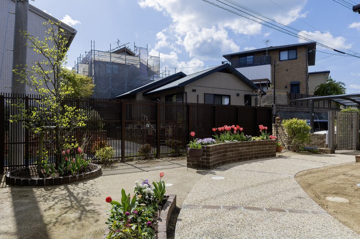 歩きやすいアプローチは、玄関からテラスにつながります。お花に導かれているうちに、歩行の運動にもなります。