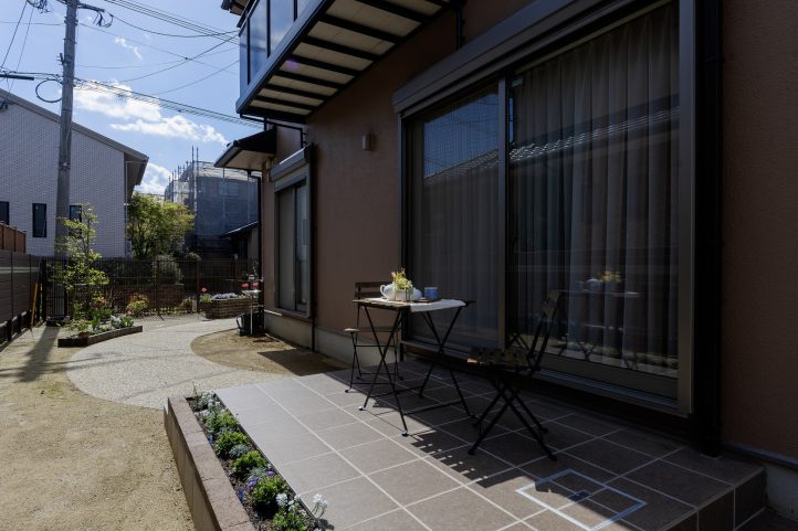 リビングからタイルテラスをアクセスにお庭でやすくなりました。