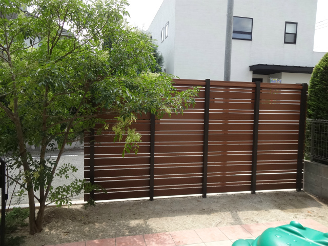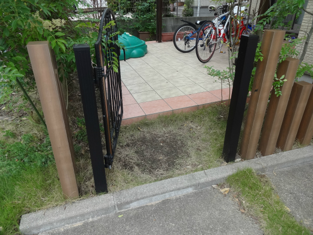 以前工事させて頂いた、お庭の入口につけた門扉と、タイルテラスに段があり、