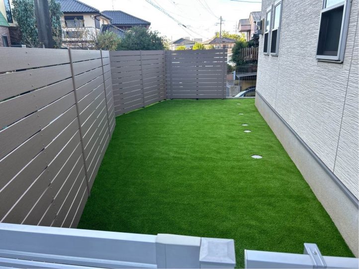 樹脂フェンスのナチュラルな質感と人工芝の色合いがマッチしていて