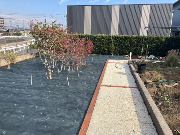 庭の奥は露出用の防草シートを敷いて雑草対策をしています。