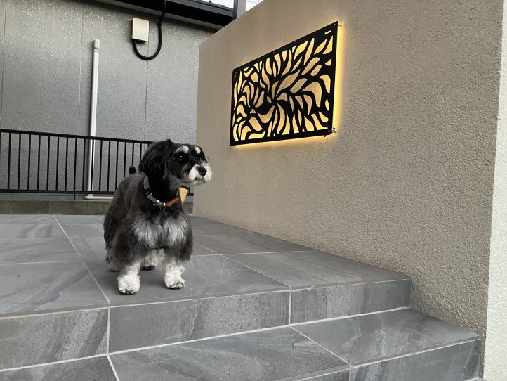 デザインウォールの後ろには600角の大きなタイルテラスとデザインパネルを付けて