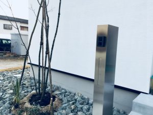 施主様こだわりの機能門柱。シャープな印象です。