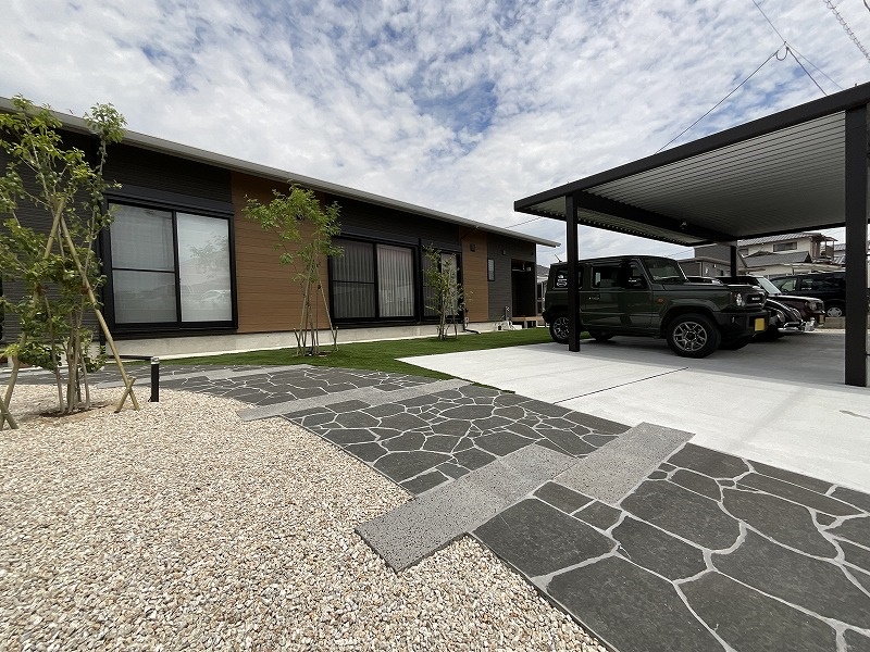 アプローチは建物外観やカーポートに合わせてかっこいい感じになるようにデザインしています。