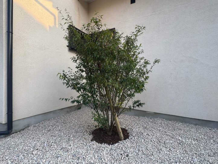 ハイノキは日陰に適したシンボルツリーということで、建物側に寄せています。