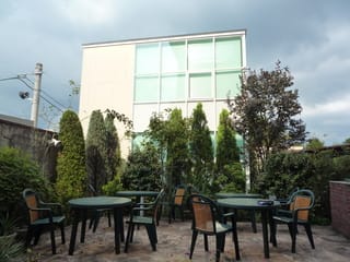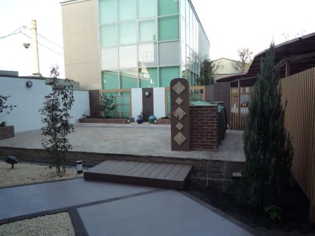 花壇には、モザイクタイルをはり、ロドレイアヘンリーという樹木を植えましたよ