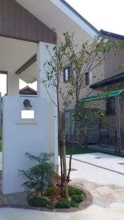 門柱はシンプルにし、シンボルツリーとして、エゴノキを植えました
