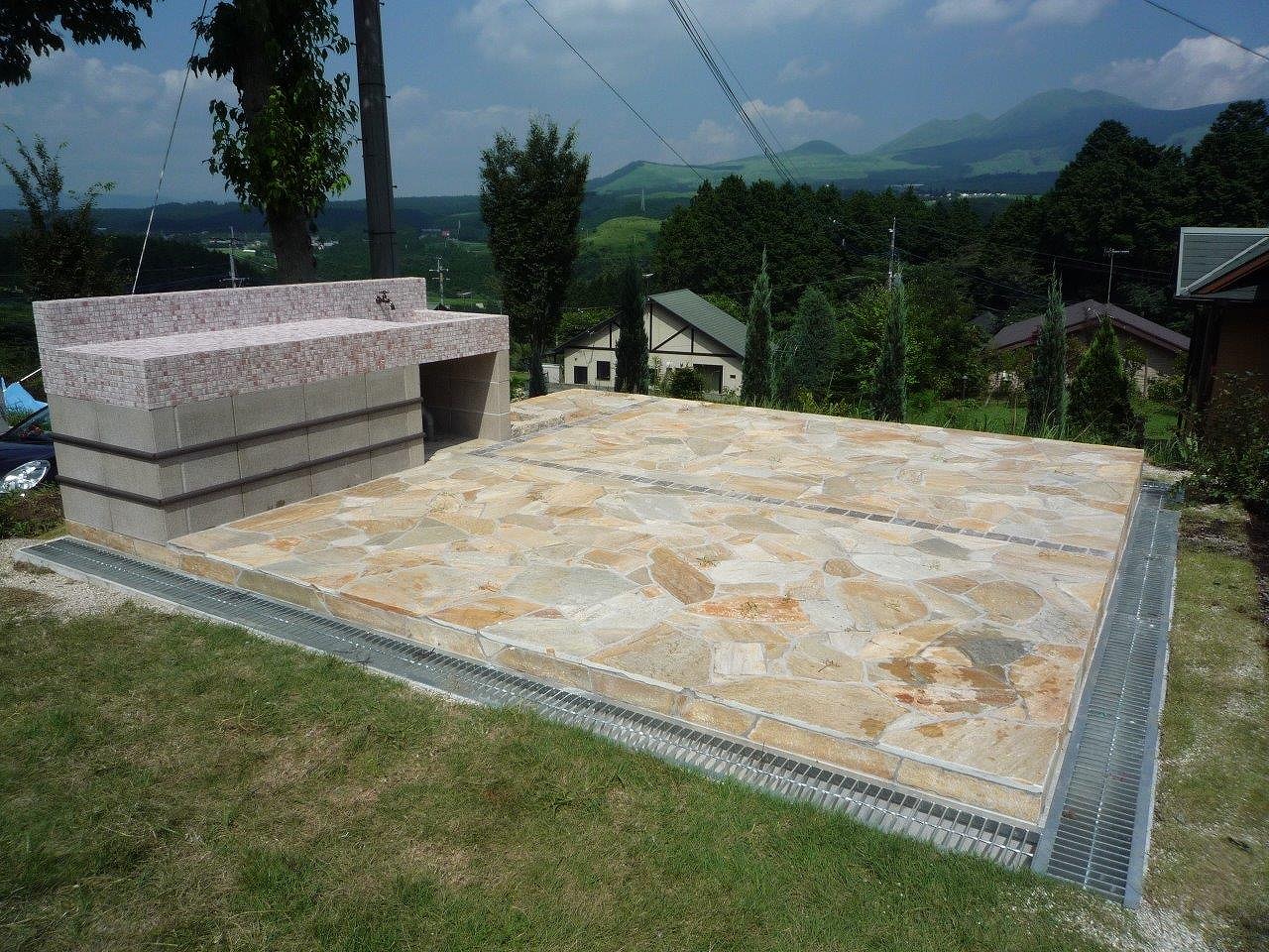 豆砂利洗い出し+自然石+レンガの組み合わせ