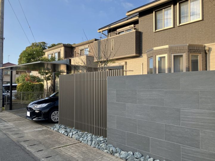 カーポート隣には LIXILプログコートフェンス(縦格子フェンス) を設置。