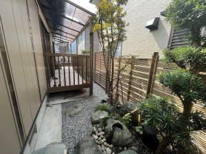樹木を撤去し、目隠しフェンスを設置。足元は砂利敷きを行い雑草対策を施しました!