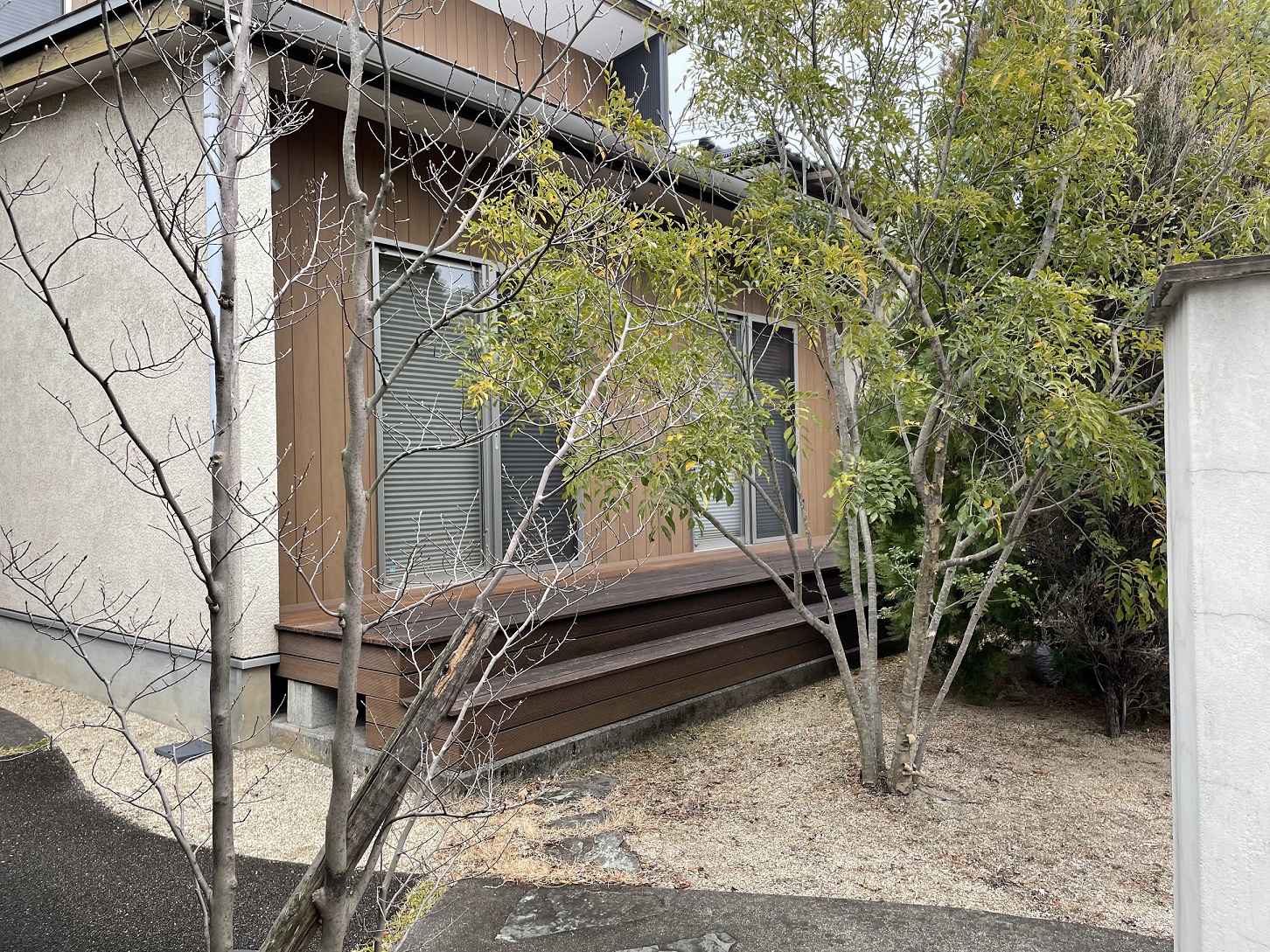 新築時に植えたシンボルツリーのカツラはそのまま残しました。存在感大♡樹木を横切るようにご自宅へ….♪