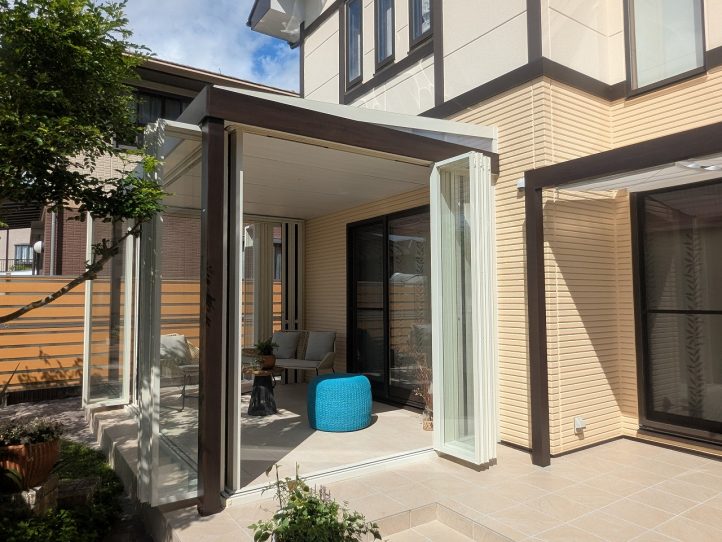 前の花壇いっぱいまでガーデンルームとタイルテラスを広げました。