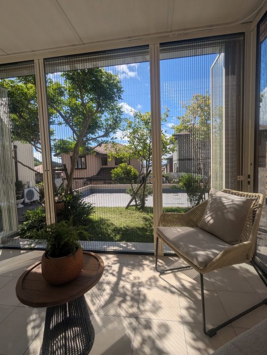 シマトネリコの木陰と伸縮網戸の影が素敵です。