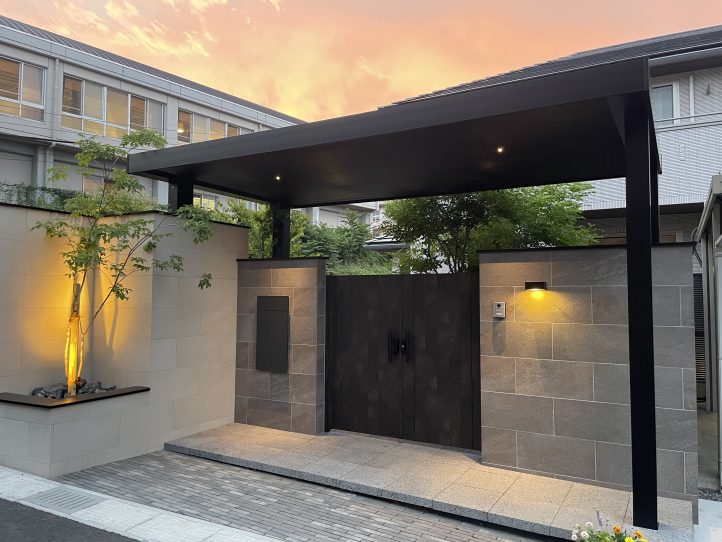 門前も、かっこよくしたい!との事でしたので、門柱上の屋根は、三協アルミのビームスのを使用。