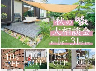 2025/09/30 お知らせ 相談会のお知らせ こんにちは。グランド工房大分南店の佐藤です。 いつまでも暑いと思っていましたが、ようやく秋めいてきましたね。 秋色お洋服、秋の味覚、紅葉・・・あっという間の秋をしっかり満喫したいです✿ さて、本日は10月1日から始まるご […] 2025/09/01 外構リフォーム 黒屋根カーポートのモダン外構 こんにちは。グランド工房大分南店の首藤です。 まだまだ暑さが続きますね。 看板猫のタマちゃんは仲良し猫のシロちゃんと お店の涼しいところを探しながら過ごしています。 さて、本日は先日施工が完了した、別府市の外構改修工事を […] 植栽 LIXIL 外構