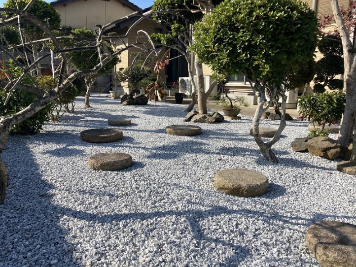 もともと敷いてあった丸い平板や灯篭を工事後にご主人様の方で、並べられており