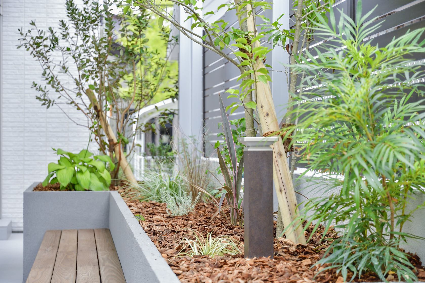 花壇や塀に高さを設け、プライベートな庭空間としています。